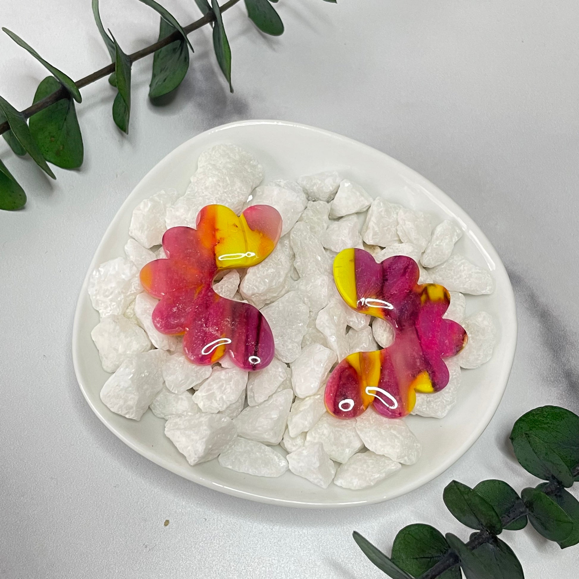 Avoid interactions with water or any oils, makeup, hairspray or perfums. To clean, use a damp cloth or baby wipe. Please take care of your earrings, although they are durable, they can break and scratch if not taken care of. When not in use please store in a cool, dry place.